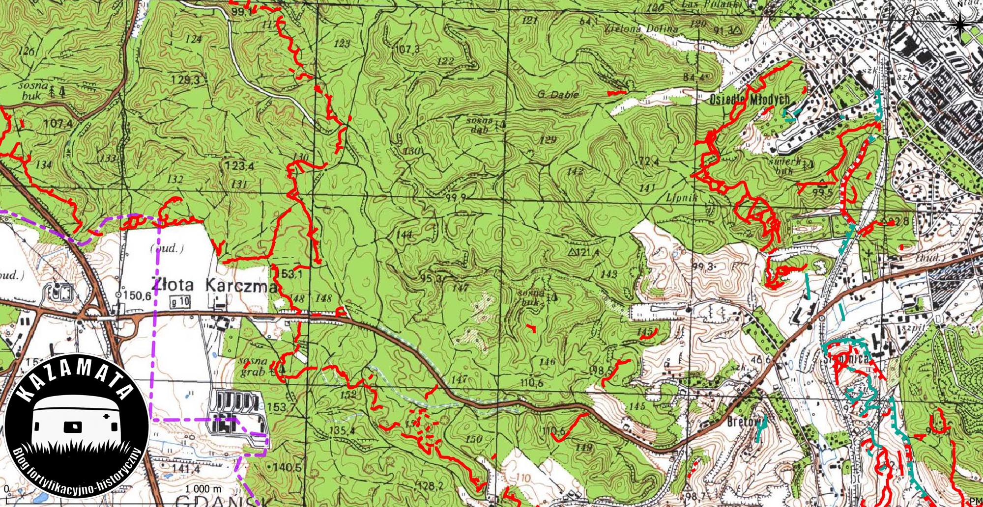 Po wycieczce narysowałem mapę okopów w Trójmieście, od Wejherowa do Gdańska. Obiekty zachowne w terenie uwidoczniłem w kolorze czerwonym (źródło Lidar), nie zachowane w kolorze grynszpan (zieleń jak nalotu na starej miedzi) (żródło zdjęcia lotnicze - dla Oliwy i Wrzeszcza). Narysowałem też przebieg rowu przeciwpancernego - "raport" stanu zachowania możesz znaleźć ->