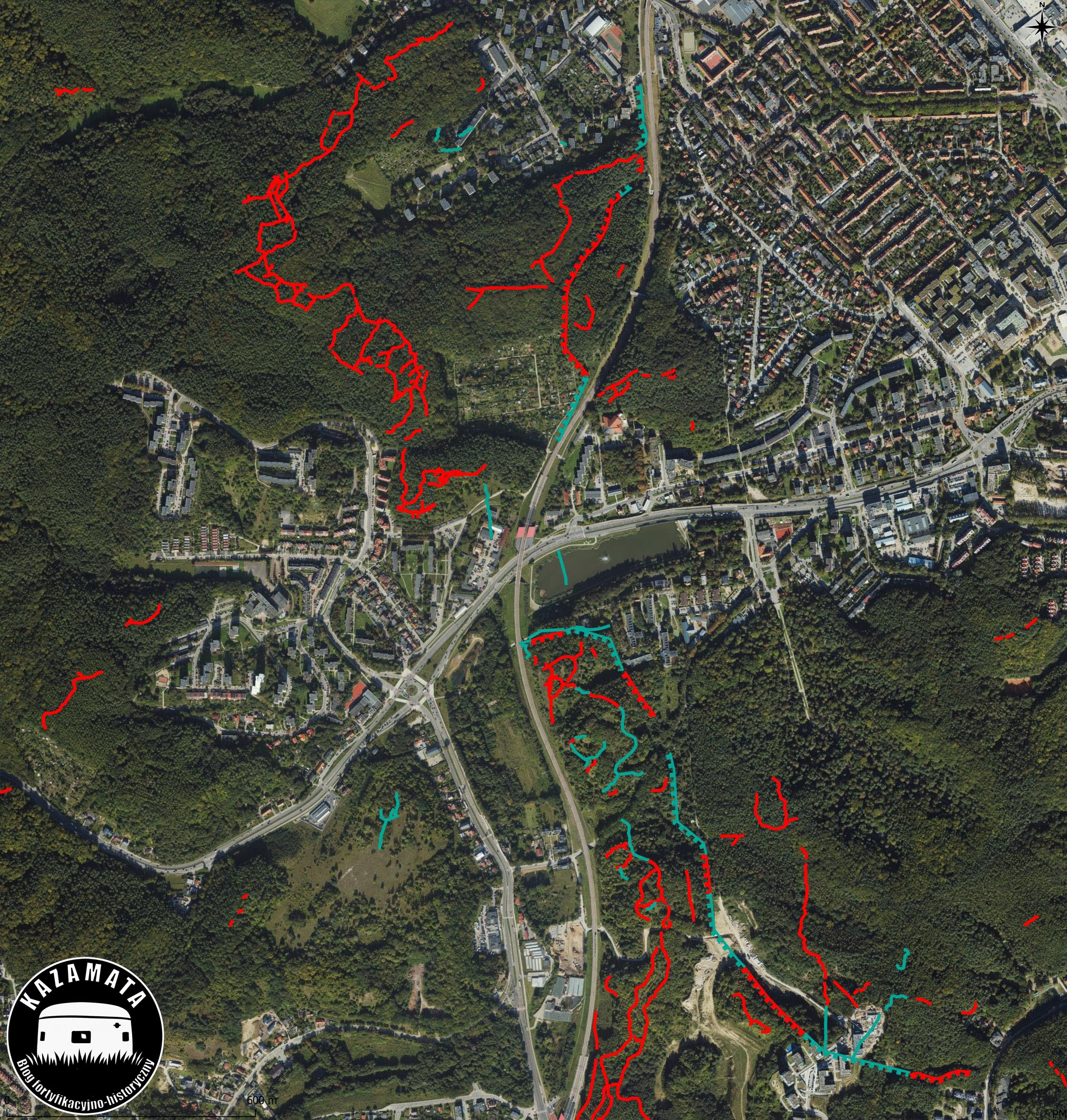 Obiekty zachowne w terenie uwidoczniłem na mapie w kolorze czerwonym (źródło Lidar), nie zachowane w kolorze grynszpan (zieleń jak nalotu na starej miedzi) (żródło zdjęcia lotnicze i mapa sztabowa z lat 50. XX wieku). Oczywiście te nie zachowane - przebieg przybliżony.