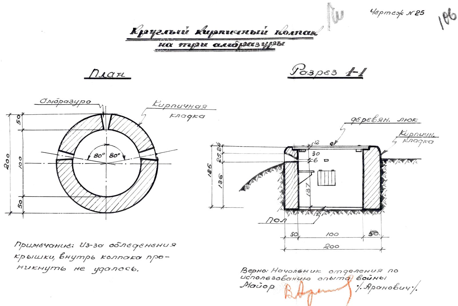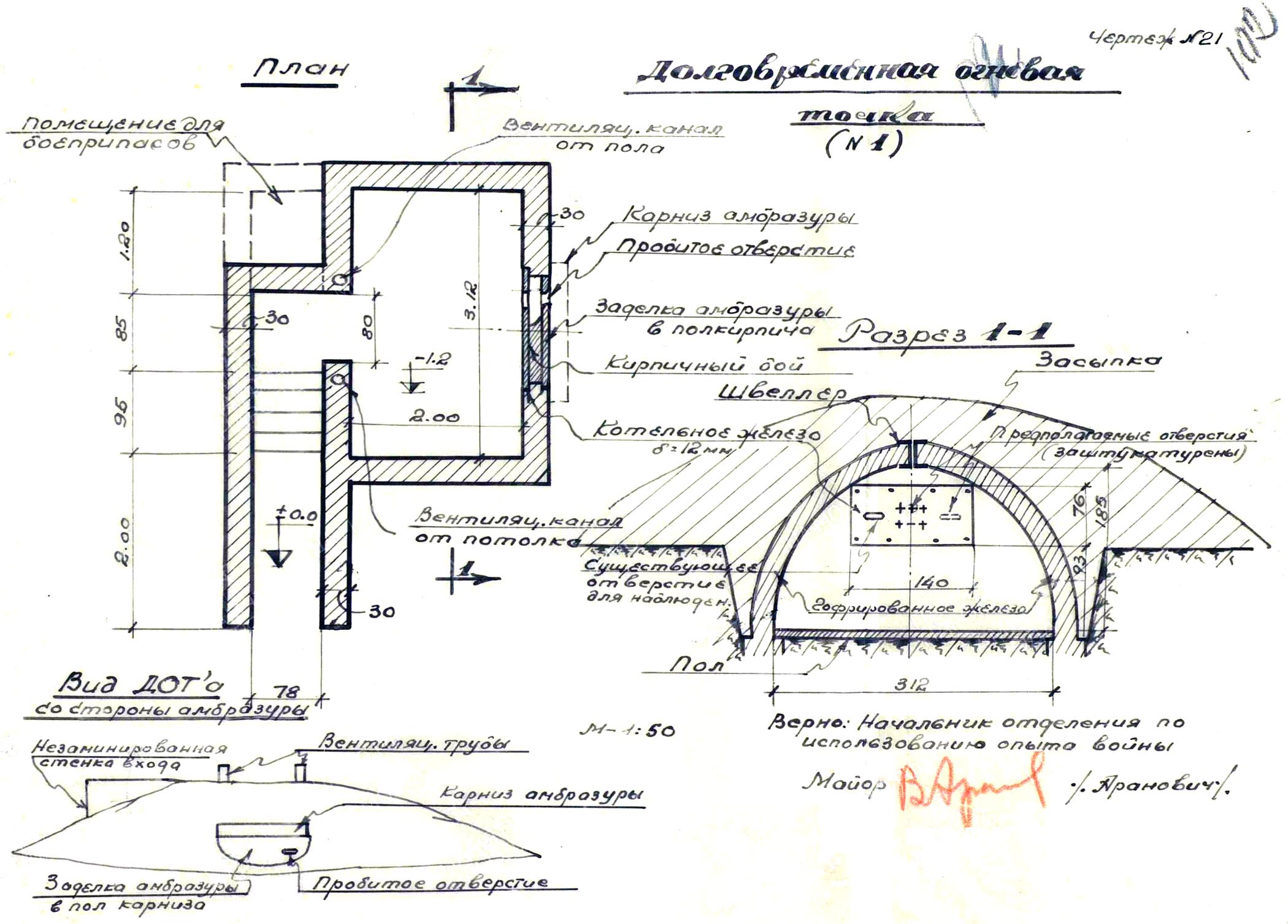 Główny kierunek do miasta wzdłuż drogi Lubawa - Iława osłaniał od skraju lasu żelazobetonowy schron nr 1 z pojedynczym karabinem maszynowym i sklepieniem z blachy falistej. W czasie pokoju otwór był zamurowany. Istniejące otwory o nieregularnych kształtach o średnicy 8-10 cm zostały wybite w konstrukcji schronu w czasie obrony /patrz rys. 21/.