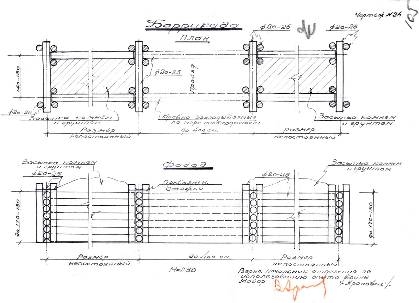 Za okopami w odległości 50-60 metrów znajdują się ziemianki na załogi z osłoną 2-3 warst drewna /patrz rys. 22, 23/.