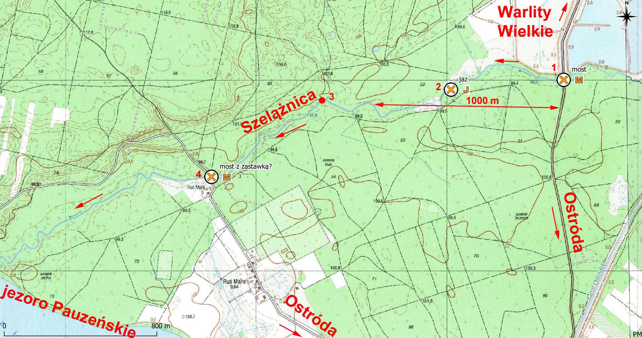 Pierwsze zdjęcie przedstawia mostek w Rusi Małej (nr 4 na poniższej mapce) od strony zachodniej. Ma dziwną konstrukcję jak na tak mały obiekt, być może od strony wschodniej ma dwie zastawki. Drugie zdjęcie według opisu "Na lewym brzegu jaz regulujący poziom wód wpływającego tu strumienia. Przepływamy pod reliktami kładki prowadzącej do jazu" (2). Trzecie zdjęcie przedstawia mostek na drodze Warlity Wielkie - Ostróda (1). Według opisu Pani Anny odległość licząc po rzece między (4) i (2) wynosi 1,5 km, tak samo między (2) a (1). Ale ta odległość druga według mapy to ok. 650 m. 1,5 km od (1) na Lidarze coś widać na rzece (3), a od południa do domniemanego obiektu dochodzi niska grobla. Temat do przepracowania, choć z powodu podmokłego terenu sprawdzenie chyba z kajaka byłoby najwłaściwsze. Jako, że od jezora Pauzeńskiego do mostku w Rusi Małej "brzegi są grząskie i niedostępne", zamknięcie zastawki przy tym mostku po pewnym czasie spowodowałoby zalananie doliny rzeczki Szelążnicy, co z położonym na południe kanałem Elbląskim stanowiłby przeszkodę nie do przebycia na tym odcinku.