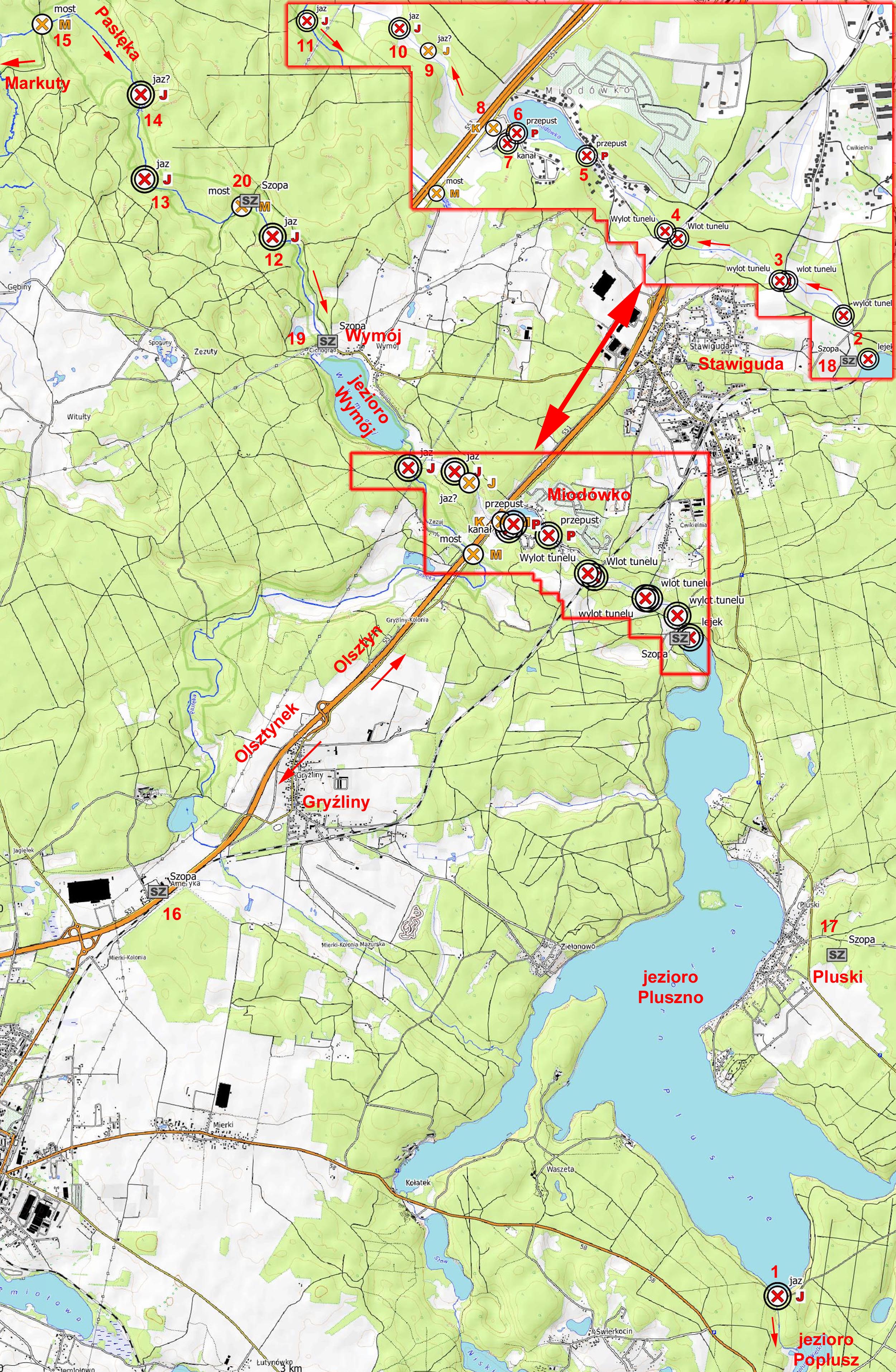Stan zachowania obiektów przedstawię za powyższym filmem z rozmową z Panem Januszem Gadzińskim z Towarzystwa Przyjaciół Olsztynka. System ma początek na południu jeziora Pluszne od betonowego kanału i jazu (1), którym można było zablokować wypływ wody do jeziora Poplusz, powodując spiętrzenie wody na jeziorze Pluszne. Wodą tą przez 3 podziemne kanały: pierwszy zaczynającym się kwadratowym wlotem koło leśniczówki Stawigudy (2), drugi pod drogą leśną (3), trzeci pod linią kolejową (4), można było zalać kolejne doliny. Przed Miodówką woda wpływała w rurę i przez przepust (5) dopływała do jeziora Miodówko. Na drugim brzegu jeziora przez przepust (6) pod drogą wiejską wpływała do kanału (8) i pod nie istniejącym mostem (8) przygotwanym do wysadzenia przelewała się za drogę Olsztynek - Olsztyn. Wodę można było spiętrzyć przez jaz (9) lub (10) (na lidarze widoczne są 2 podejrzane miejsca), doprowadzając do zalania doliny i drogi. Jaz (11) na Pasłęce jest prawdopodobnie związany z pobliskimi stawami. System zalewów na Pasłęce składał się z 3 jazów między jeziorami Wymój i Szeląg (12), (13) i (14). Pozycje jazów: (12), (13) - Lidar, (14) - domniemana. Most między Makrutami i Unieszewem (15) prawdopodobnie był/jest wyposażony w komory minowe.