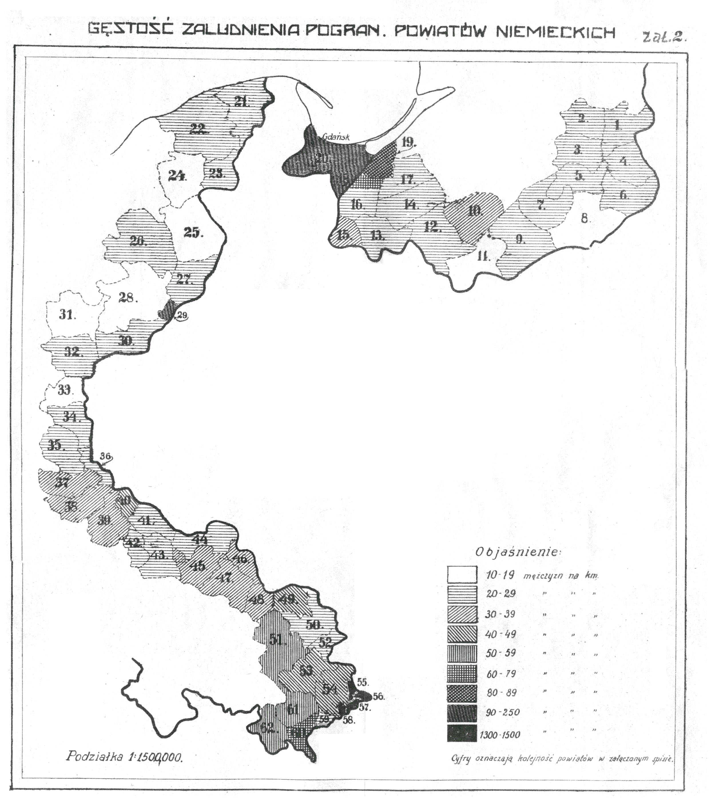 b/. Rezerwuary mobilizacji personalnej. Są nimi przede wszystkim odcinki strefy granicznej, gęsto zaludnione /Patrz załącznik Nr.2./, a więc Górny Śląsk i kilka powiatów na pozostałych odcinkach. Pod tym względem najmniej dotkliwą byłaby przedwczesna strata słabo zaludnionych powiatów Prus Wschodnich i Pomorza. Takie, czy inne siły organizacyj cywilno-wojskowych na poszczególnych odcinkach nie zmieniają sytuacji, zważywszy, że: 1) ich członkowie i tak już są zaangażowani w osłonie, 2) mobilizacja prędzej, czy później oparta będzie na powszechnym powołaniu.