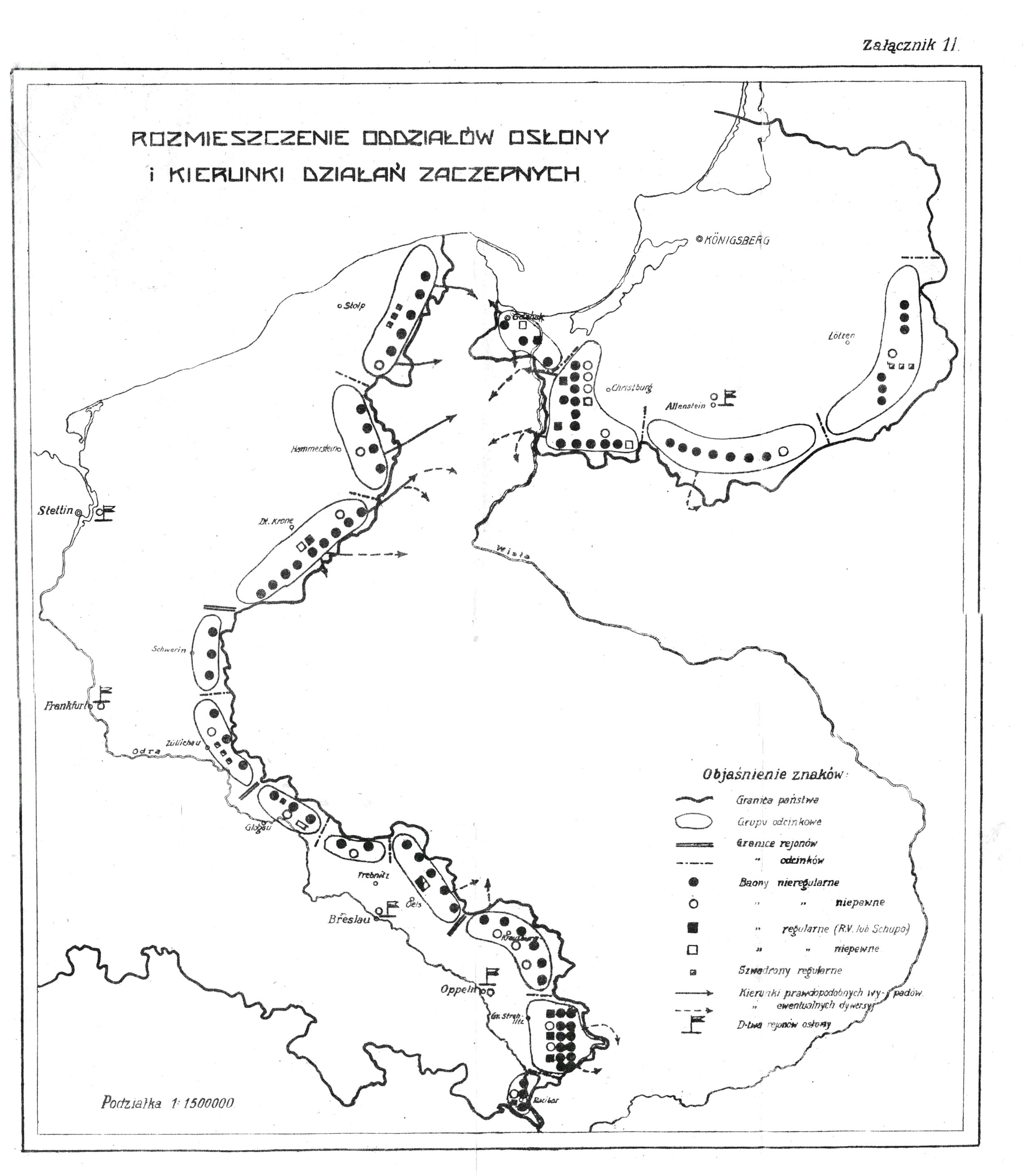 Poza założeniami do gier wojennych, posiadającymi tylko względne znaczenie,oraz inspiracjami,brak jakichkolwiek danych dokumentalnych, wyjaśniających istotne zamiary Niemców w osłonie. Brak również informacji, dostatecznie sprawdzonych. Niektóre posiadane są sprzeczne z założeniami do gier wojennych i ćwiczeń polowych. Bardzo możliwe,że obowiązujące dotychczas plany podlegają właśnie obecnie rewizji, względnie uzupełnieniu w związku z postępem przygotowań. Tak np. stwierdzono w listopadzie w Prusach Wschodnich obecność tajemniczej komisji, liczącej rzekomo ca 70 oficerów z "Heeresleitung", Gruppenkomando 1, dowództwa 1. dywizji i jednostek regularnych i nieregularnych. Komisja ta przeprowadzała rekonesans terenu pogranicznego, mając swoją bazę w Olsztynie. Na innych odcinkach nie zauważono obecności takiej komisji. Przy takim stanie rzeczy można ustawić tylko hipotezy, oparte na analizie terenu i obustronnych sił. Hipotezy takie mogą oczywiście poważnie odbiegać od rzeczywistości. Ponadto pamiętać trzeba o tym, że plany opracowane w pokoju ulec mogą znacznym zmianom, zależnie od takiego, czy innego zachowania się naszej osłony. Odcinki zasadniczo bierne - w razie stwierdzenia słabości, lub bierności naszej osłony, mogą otrzymać zadania aktywne, oczywiście ograniczone możliwościami lokalnymi. Podstawowe plany działania przedstawiają się przypuszczalnie następująco: Zasadniczo utrzymać strefę pograniczną jak najdłużej, nie dopuszczając jednak zupełnego zniszczenia "Grenzschutzu". Gdzie tylko to możliwe, przeszkadzać naszej mobilizacji i ewakuacji przez płytkie wypady, szczególnie na węzły komunikacyjne i ośrodki mobilizacji na odcinkach o ludności mieszanej. W miarę możności odciąć nas, choćby częściowo, od eksponowanych ośrodków naszej wytwórczości przemysłowej /Górny Śląsk/, względnie punktów styku z zagranicą /Gdynia/ i dążyć do opanowania dogodnej bazy dla późniejszych operacji oddziałów regularnych. Na poszczególnych odcinkach plany działania przedstawiają się przypuszczalnie następująco: A/. Prusy Wschodnie. Liczyć się trzeba z dwoma możliwościami: a/. Hipoteza "defensywna". Na całym odcinku postawa defensywna, przy czym na pododcinku wschodnim i środkowym "Grenzschutz" mógłby manewrować w dość głębokiej strefie /patrz "tylna granica pasa osłony" str.11 /, wykorzystując liczne przeszkody naturalne dla opóźnienia naszego ewentualnie debuszowania [przechodzić w rozwiniętym szyku do walki po przebyciu gór, lasów]. Na wstępie "Grenzschutz" utworzyłby przypuszczalnie kilka kordonów /2 lub 3/. Słaby, obserwacyjny wzdłuż granicy /o 3-5 km wgłąb/ z opuszczeniem eksponowanych występów, a za nim silniejszy, posiadający pewne zgrupowania na ważniejszych kierunkach. Kordon ten, będący pierwszą linią oporu,powstałby przypuszczalnie na linii: jezioro Wisztynieckie - Olecko - Wieliczki - Pisanica - na południe od Ełku -Biała Piska - Karwica - Wielbark - Nidzica - Gardyny - Samborowo - Iława - Kisielice - na południe od Kwidzyna. Powstanie dalszych kordonów na następnych liniach oporu na niektórych odcinkach możliwe, na innych zależnie od rozwoju wypadków. Na odcinku nadwiślańskim "Grenzschutz" próbowałby niechybnie utrzymać linię Wisły oraz Gdańsk. Alternatywa ta jest możliwa, jednak mniej prawdopodobna niż druga: b/. Hipoteza "działań mieszanych". Zadania odcinka wschodniego i środkowego bez zmiany. Co najwyżej, w razie stwierdzenia słabej naszej osłony na odcinku Jabłonowo - Działdowo, możliwa byłaby próba opanowania, względnie zniszczenia węzła Działdowo celem przecięcia linii Warszawa - Grudziądz. Na odcinku zachodnim uporczywe krycie lewej flanki grupy zaczepnej /na pododcinku Iława - Kwidzyn/, debuszującej przez Wisłę przy współdziałaniu jednostek gdańskich. Zadanie grupy zaczepnej może ograniczyć się do opanowania i zabezpieczenia mostów na Wiśle /ewentualnie tylko mostu w Tczewie/ albo przewidywać głębszy wypad na spotkanie grupy pomorskiej, debuszującej ku wschodowi. Współdziałanie grupy gdańskiej ograniczyłoby się prawdopodobnie tylko do otwarcia przeprawy pod Tczew, albowiem część tej grupy przypuszczalnie skierowałaby się na Gdynię. Tym bardziej wschodnio-pruska grupa wypadowa musiałaby być wzmocniona jednostkami regularnymi i posiłkami nieregularnymi z poza strefy osłonowej, gdyby miała debuszować wgłąb korytarza. B/. Pomorze. Alternatywa defensywna jest tutaj jeszcze mniej prawdopodobna. Bierne zachowanie się grupy pomorskiej: 1/. umożliwiłoby nam ewakuację Gdyni i całego, północnego Pomorza, 2/. utrudniłoby poważnie koncentrację niem. sił regularnych wobec niemożności wykorzystania najwydajniejszej linii kolejowej Krzyż - Chojnice, 3/. utrudniłoby późniejsze odzyskanie połączeń z Prusami Wschodnimi. Brak większych garnizonów polskich w korytarzu, oraz częściowo mieszany skład jego ludności, zdają się ułatwiać wczesne podjęcie kroków zaczepnych, zmierzających bądź tylko do połączenia z Gdańskiem i do zabezpieczenia linii kolejowej Krzyż - Chojnice, bądź nawet do opanowania możliwie całego korytarza i stworzenia połączeń z Prusami Wschodnimi przynajmniej na północ od Grudziądza. Najprawdopodobniejsza jest możliwość pierwsza z tym, że także na południe od linii kolejowej Chojnice - Tczew "Grenzschutz" wystąpi aktywnie, jednak tylko celem zabezpieczenia linii kolejowej Krzyż - Chojnice przez zajęcie Sępolna, Więcborka, Łobżenicy i małych przyczółków na Noteci, na południe od Piły i Krzyża. Główne grupy wypadowe,zasilone słabymi oddziałami regularnymi, zbiorą się przypuszczalnie koło Lębork, Bytów, Człuchów i Złotów - Piła. Na pozostałych odcinkach utworzy się słaby kordon obserwacyjny, który,w miarę postępów grup wypadowych, bądź posuwałby się naprzód, bądź likwidował