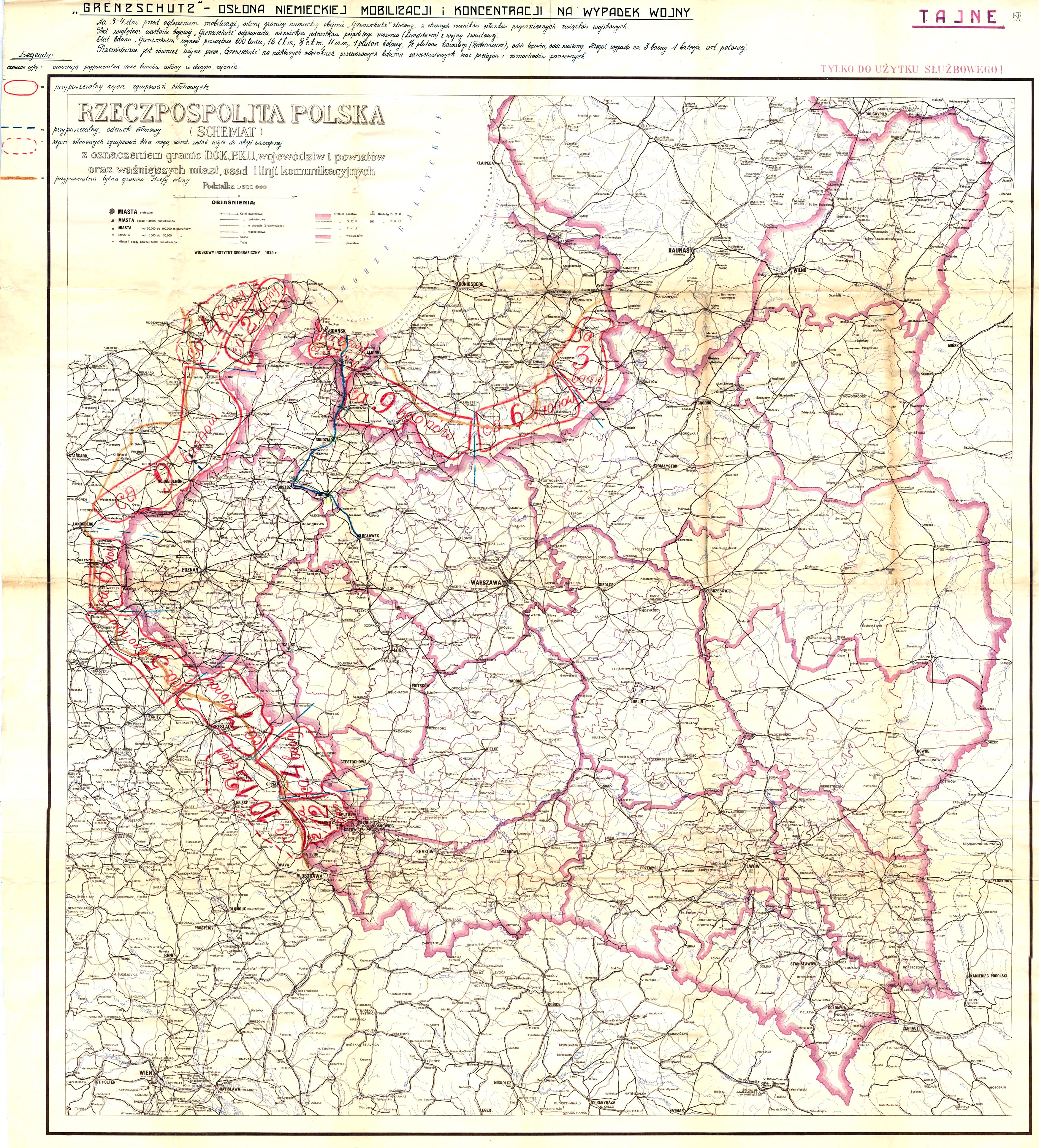 "GRENZSCHUTZ" - OSŁONA NIEMIECKIEJ MOBILIZACJI i KONCENTRACJI NA WYPADEK WOJNY Na 3-4 dni przed ogłoszeniem mobilizacji, osłonę granicy niemieckiej obejmie "Grenzschutz" złożony z starszych roczników członków pogranicznych związków wojskowych. Pod względem wartości bojowej "Grenzschutz" odpowiada niemieckim jednostkom pospolitego ruszenia (Landsturm) z wojny światowej. Etat baonu "Grenzschutzu" wynosi przeciętnie 600 ludzi, 16 l.k.m, 8 c.k.m, 4 m.m, 1 pluton kolarzy, 1/2 plutonu kawalerii (Reitervereine), oddz. łączności, oddz. sanitarny. Na ogół wypada na 3 baony 1 bateria art. polowej. Przewidziane jest również użycie przez "Grenzschutz" na niektórych odcinkach przewozowych kolumn samochodowych oraz pociągów i samochodów pancernych. Legenda: czerwone cyfry - oznaczają przypuszczalną ilość baonów osłony w danym rejonie. [Czerwony owal] = przypuszczalny rejon zgrupowań osłonowych [Niebieska przerywana linia] = przypuszczalny odcinek osłonowy [Czerwony przerywany owal] = rejony osłonowych zgrupowań, które mogą ewent. zostać użyte do akcji zaczepnej [Pomarańczowa gruba linia] = przypuszczalna tylna granica Strefy osłony.