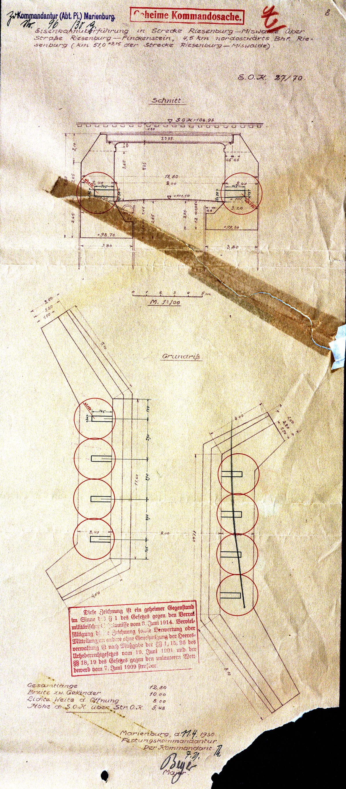 Niezrealizowany projekt komór minowych z 1930 roku z 2 nowymi komorami w zachodnim przyczólku. Dobrze widoczna stara komora w poludniowej nitce mostu. (BAMA). Powieksz rysunek |