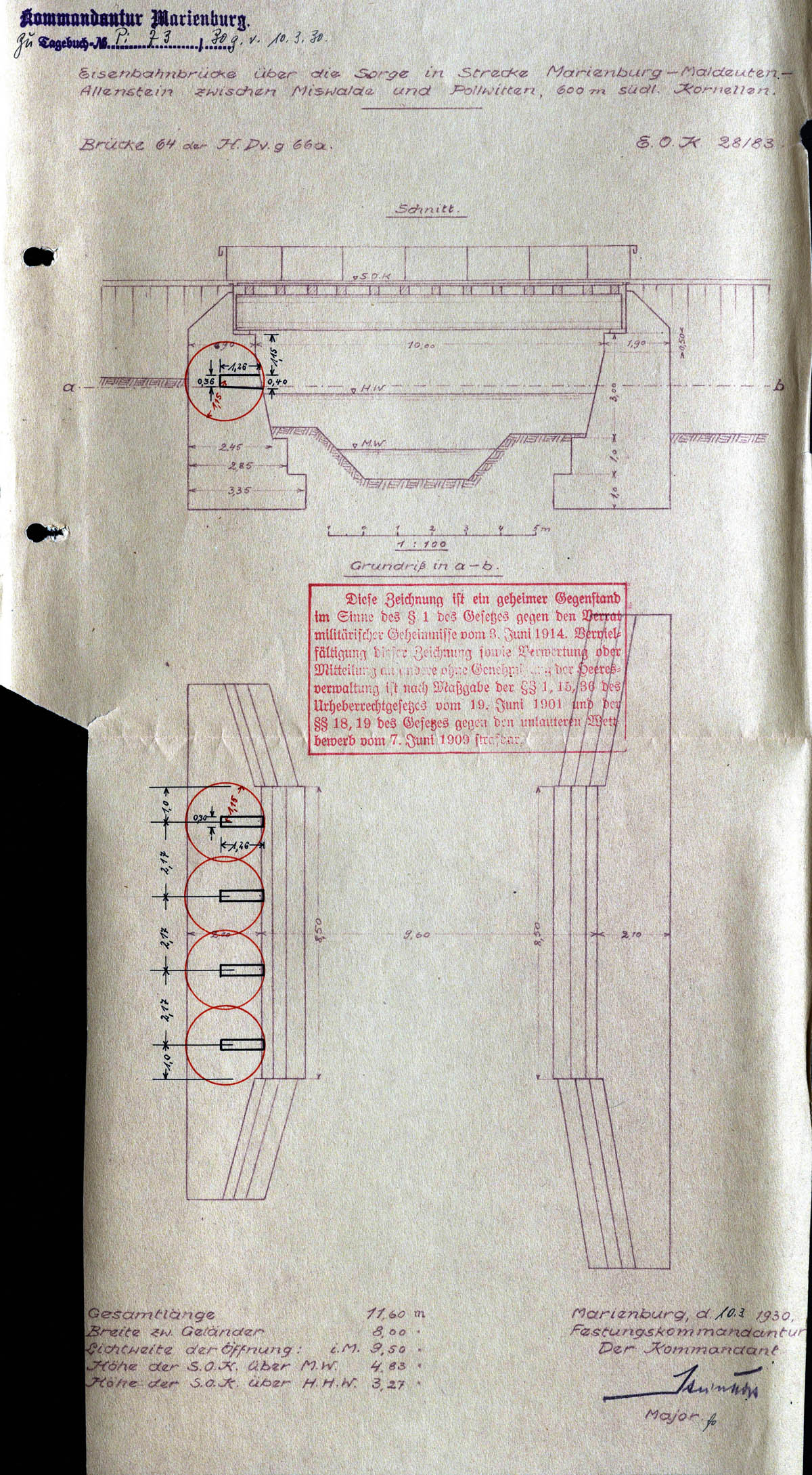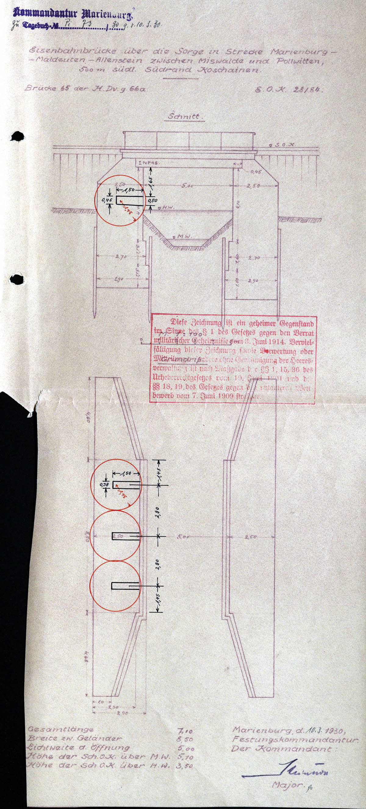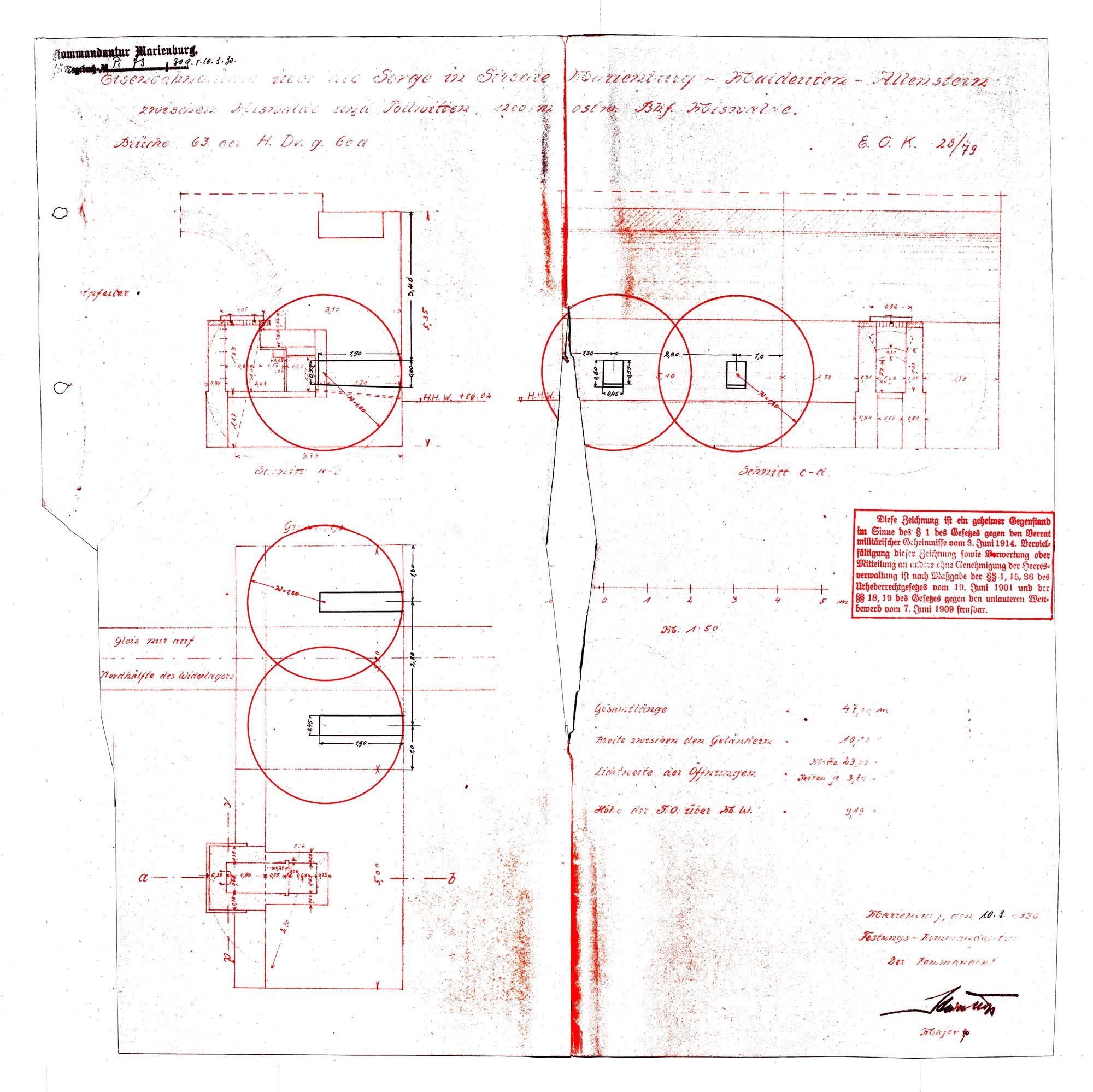 Linia kolejowa Myslice - Maldyty zostala uruchomiona jako jednotorowa w roku 1893. Na poczatku 1930 roku oficerowie oddzialu saperskiego Festungskommendentur Marienburg dokonali inspekcji mostów na tej linii. Stwierdzili, ze "Mosty zostaly okolo 1916 roku podwojone pod wzgledem szerokosci, a tor przeniesiono na nowa polowe przyczólków". Podczas ogledzin mostów z kierownikiem rejonu kolejowego w Maldyty ustallili, ze instalacje minowe na mostach kolo Korneli i Koszajn juz nie istnieja. Przy moscie kolo Koszajn, podczas próbnych wykopów, odnaleziono resztki murowania szybu minowego. Wnioskowano by kolej odbudowala na wlasny koszt zniszczone urzadzenia minowe. Po sprawdzeniu, czy przywrócone komory umozliwia wystarczajace zniszczenie danego obiektu inzynieryjnego, powstaly plany wybudowania komór równiez w pozostalych przyczólkach. Badania terenowe wykazaly, ze nie zostaly zrealizowane, a w roku 1939 mosty nr 63, 64 i 65 nie znalazly sie juz w planie zapór. Prawdopodobnie nie odbudowano tez zniszczonych komór w mostach nr 64 i 65.