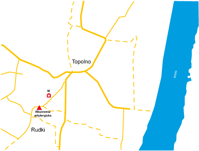 Lokalizacja: Wozownia znajduje się właściwie na terenie wsi Rudki, przy drodze gruntowej prowadzącej do tej wsi z Topolna. Schron amunicyjny umiejscowiony jest ok. 500m od wozowni, na skaju głebokiego jaru.