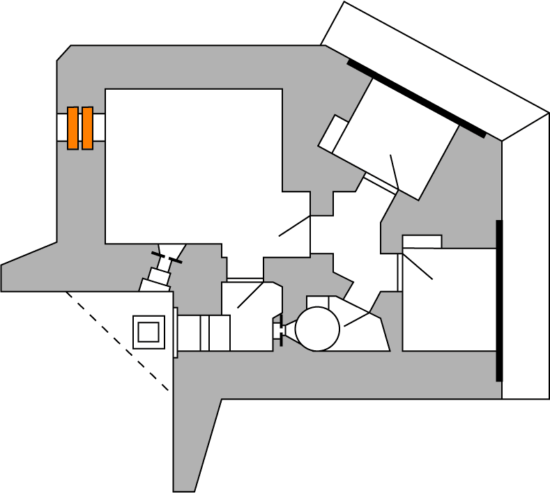 Schron bojowy dla 2 km (płyty 7P7, kąt między strzelnicami 90˚) z kopułą obserwacyjną i izbą pogotowia |